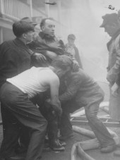 Most of the men in our area served as volunteer firemen. Here, my grandfather receives help from his buddies after falling off a roof fighting a hotel fire. (He was okay!)